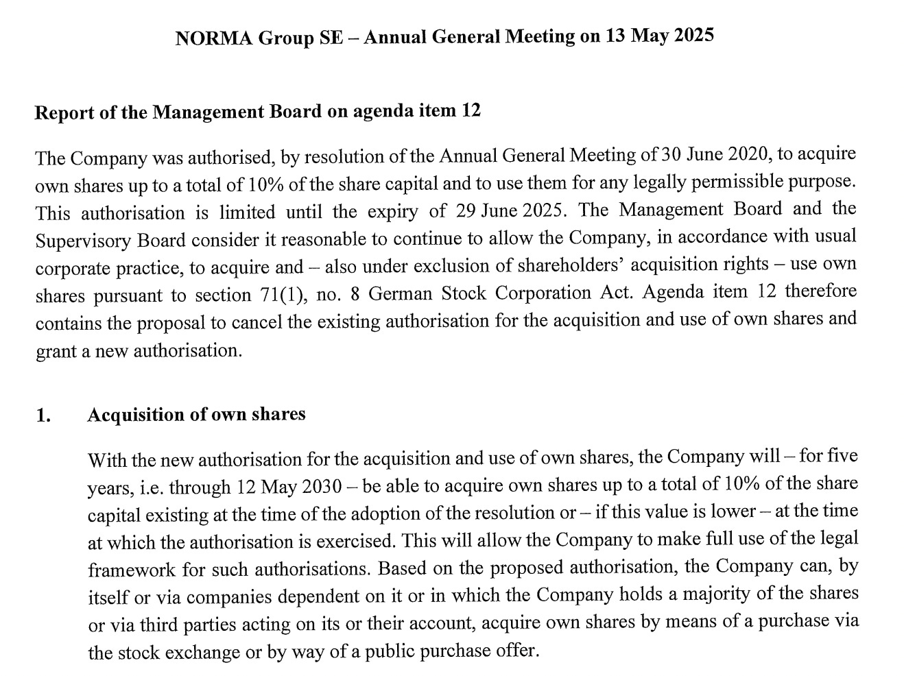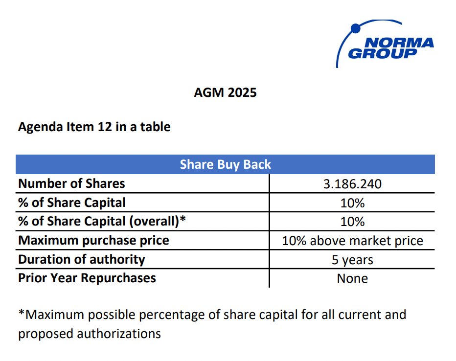 Anyway, Norma is limited to 10% of outstanding shares, that’s “only” around €60m even at €20 per share, so the tender offer is the big piece. This requires a vote at the AGM. As of today, the AGM is set for May 21 (though there’s a possibility it could be postponed).