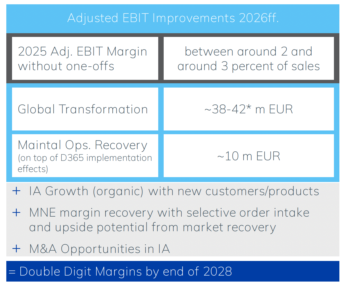 The goal of NewNorma is to get to a double digit margin by 2028, while expanding the revenue base both organically and through M&A through the €70m set aside from the Water segment sale, plus potentially utilizing debt, as management mentioned their ability to get to a leverage of Net Debt/Ebitda of 1.5x (M&A operation(s) could take place in 2026 based on their presentation from last September).