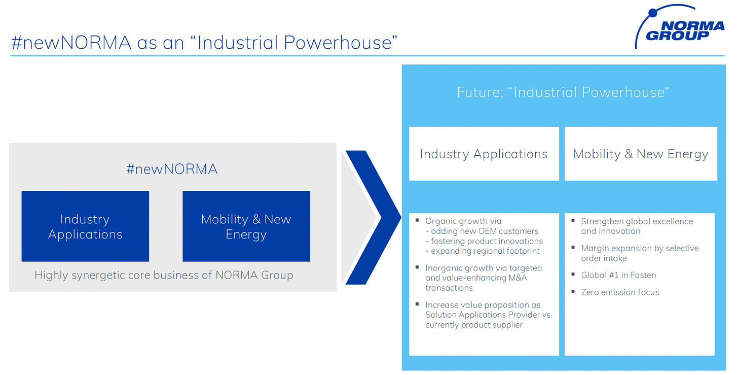 The second part of the story is a bit more complex, or, at least, will take more time. After selling the water management segment, Norma will consist of the Mobility segment and of the Industry segment. This is NewNorma.